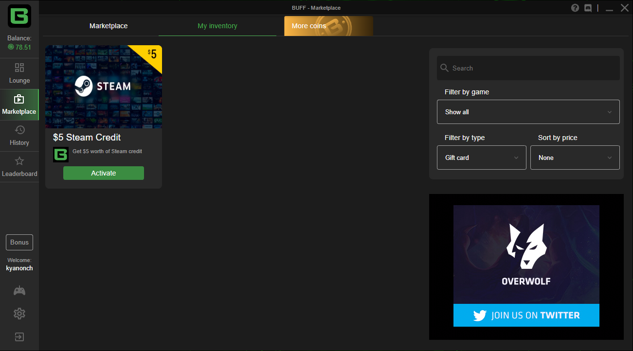 交換するとMy inventoryの中に$5 Steam Credit があるので Activate を押します。