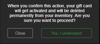 このアクションを確認すると、ギフトカードがアクティブになり、インベントリから完全に削除されます。 続行しますか?と表示されます。Yes, I understand を押します。